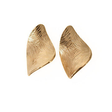 Pendientes de acero con acabado dorado y diseño en forma de hoja estilizada. Su superficie...