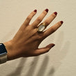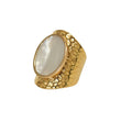 Anillo acero dorado de 3cm. de ancho. De diseño robusto y elegante, su superficie presenta un martillado que le aporta textura y carácter, mientras que una pieza de nácar blanco, suave y luminosa, corona el centro con un brillo natural.