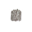 Anillo de acero plateado con un ancho de 2,4cm. Este anillo presenta una base de chapa con pequeñas hendiduras cuidadosamente dispuestas que simulan ramitas delicadamente entrelazadas.
