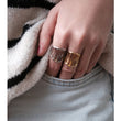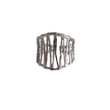 Anillo de acero plateado que destaca por su diseño moderno. Con un ancho de 2 cm., este anillo tiene una presencia llamativa en cualquier dedo. Su superficie está adornada con láminas en zig zag, que le dan un toque dinámico. Ajustable.