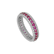 Anillo envuelto en circonitas fucsia con un grosor de 5mm. Disponible en Plata de Ley 925 y en Baño de Oro 18kts.