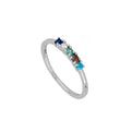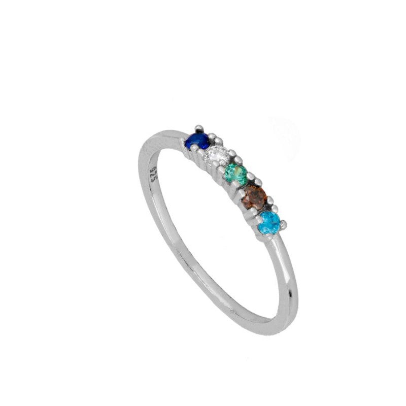 Anillo con cinco circonitas de colores de 2,2mm. cada una. Disponible en Plata de Ley 925 y en Baño de Oro 18kts.