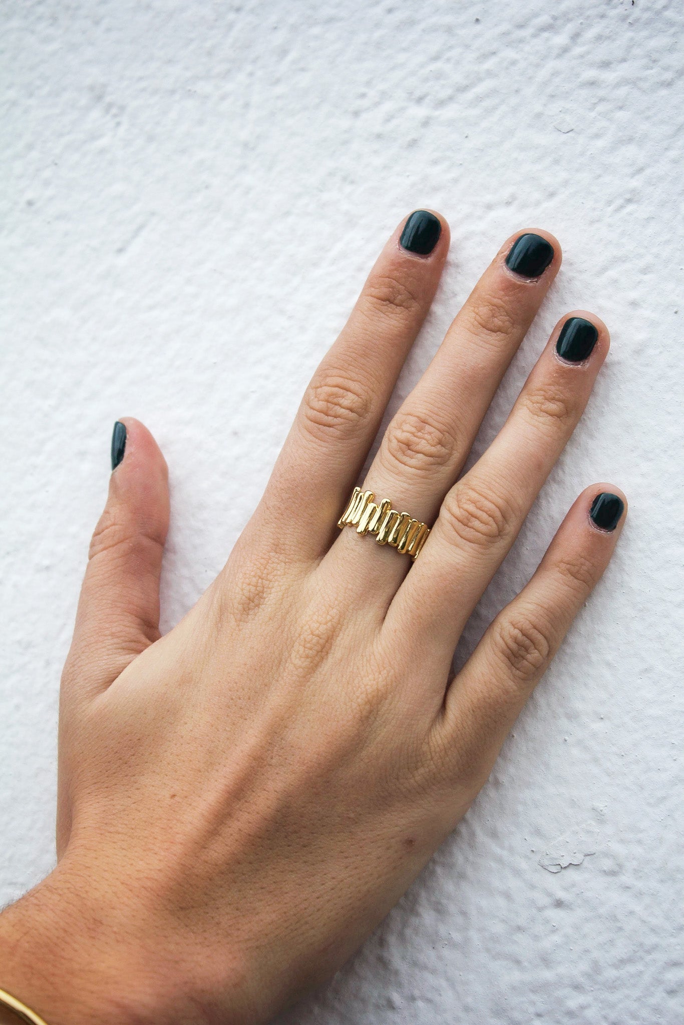 Anillo con rectángulos irregulares con un ancho de 9mm. Disponible en Plata de Ley 925 y en Baño de Oro 18kts.