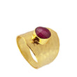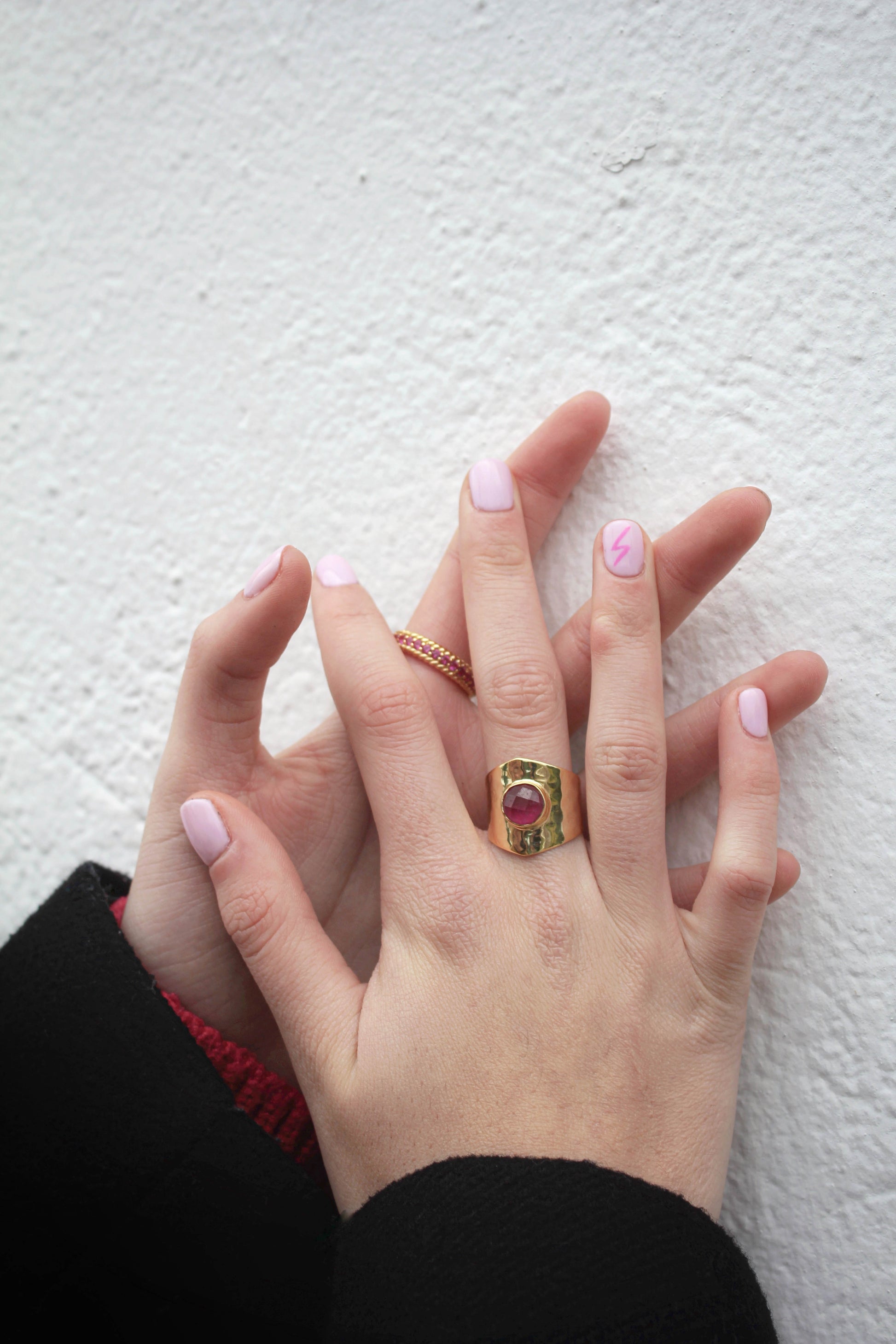 Anillo de 2cm. en su parte más ancha, con una ropada roja de 8mm. Disponible en Plata de Ley 925 y en Baño de Oro 18kts.