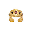 Anillo acero dorado de 14mm. de grosor, martillado y con cinco circonitas de colores. Anillo ajustable.