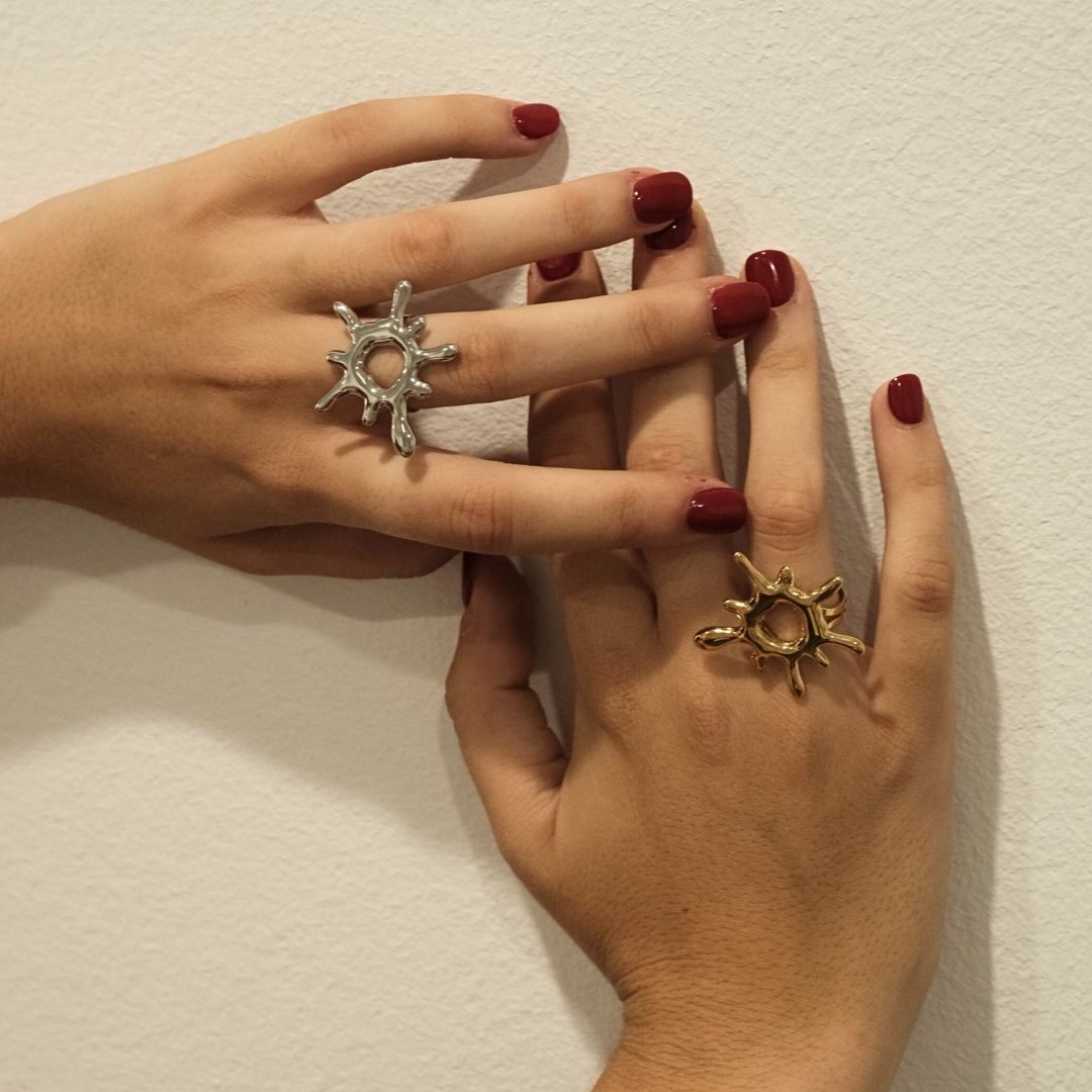 Anillo acero dorado en forma de sol con bordes irregulares y centro hueco. Ajustable.