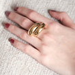 Anillo de acero dorado con un ancho de 1,8cm. Este anillo tiene dos barritas curvadas que le dan un enfoque moderno y dinámico. Ajustable