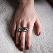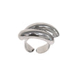 Anillo de acero plateado con un ancho de 1,8cm. Este anillo tiene dos barritas curvadas que le dan un enfoque moderno y dinámico. Ajustable.
