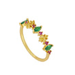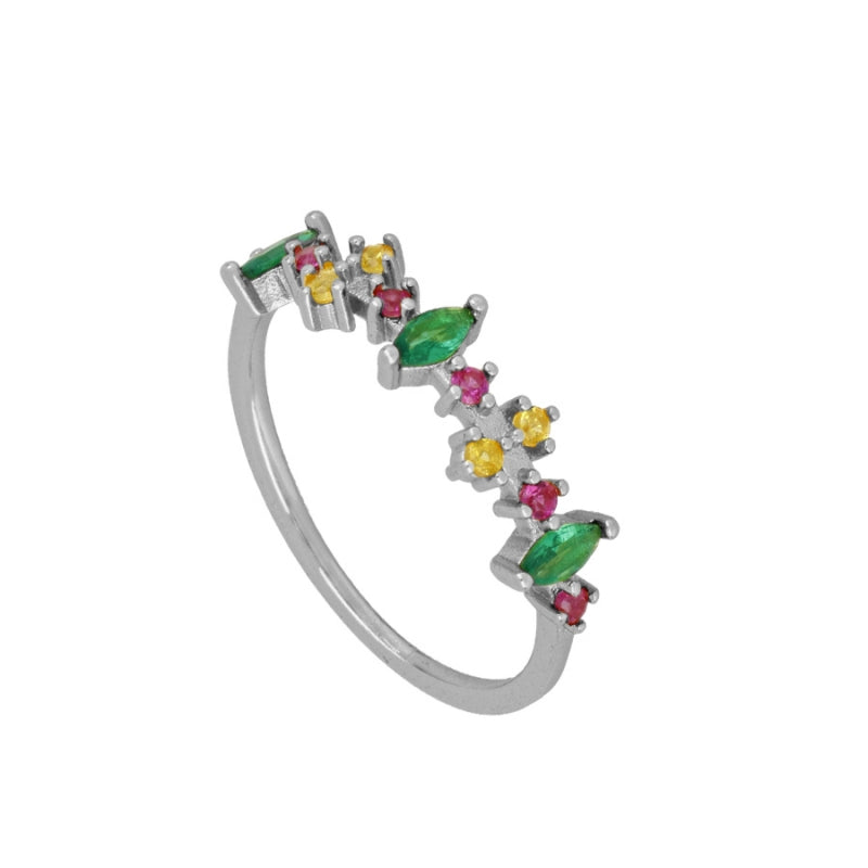 Anillo con nueve pequeñas circonitas en fucsia y amarillo y tres circonitas verdes. Disponible en Plata de Ley 925 y en Baño de Oro 18kts.