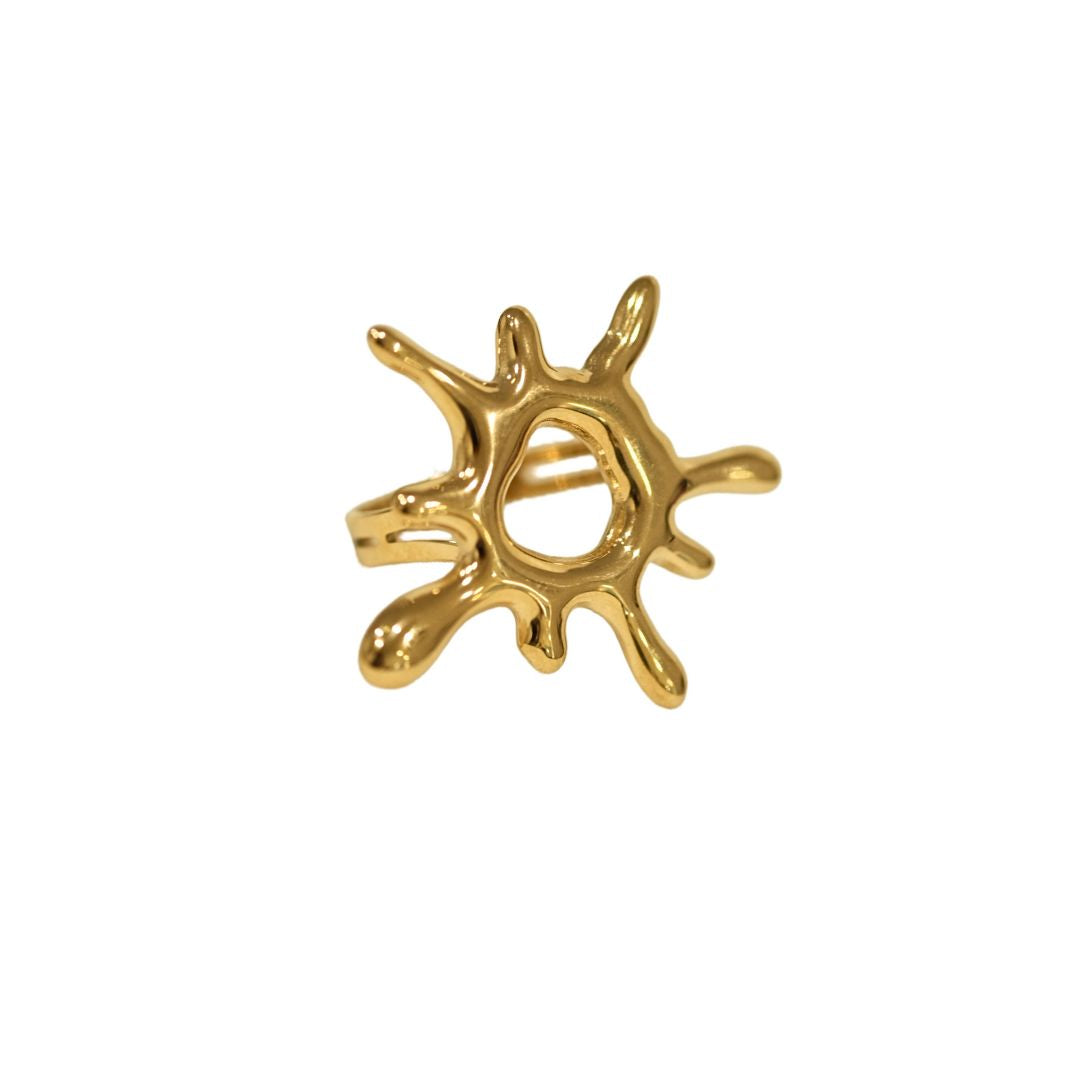 Anillo acero dorado en forma de sol con bordes irregulares y centro hueco. Ajustable.
