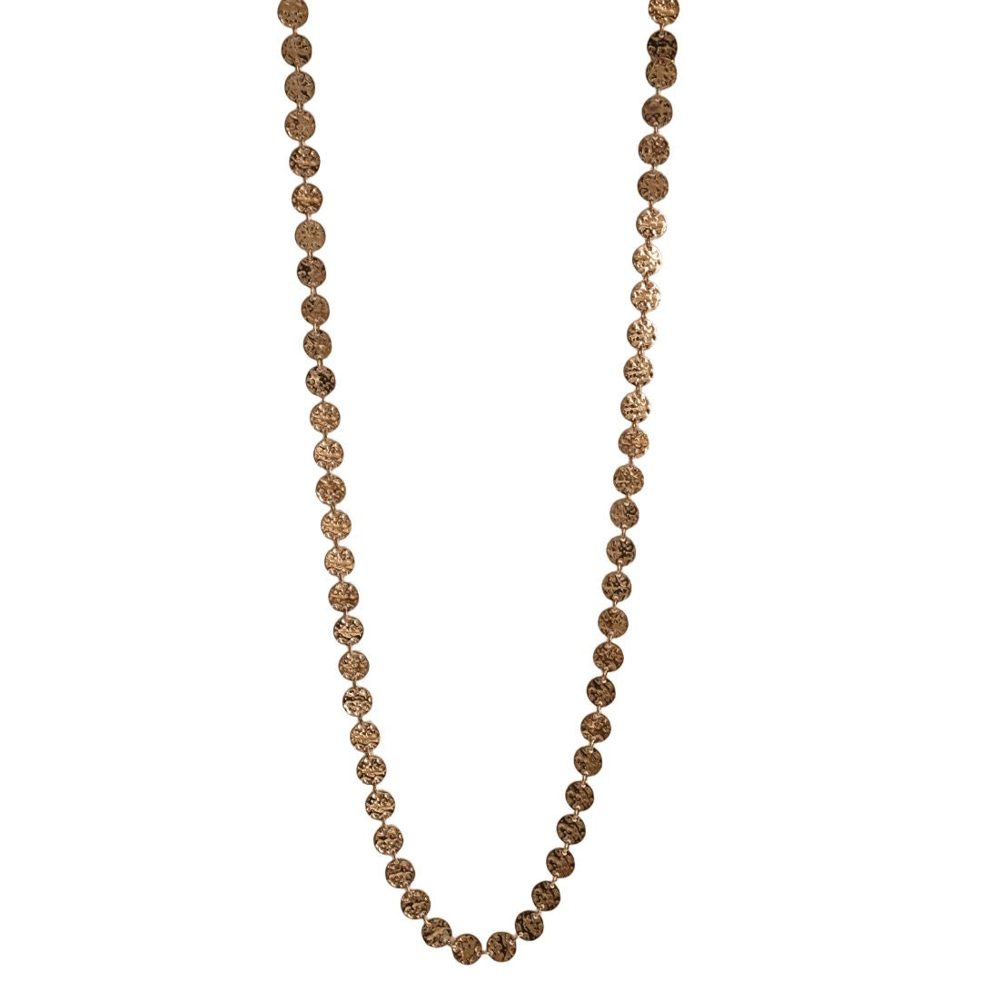 Collar acero dorado de 91cm. graduable a 96cm. Está compuesto por delicados discos metálicos con textura martillada, que capturan la luz con cada movimiento. Su diseño versátil permite llevarlo solo para un efecto elegante y minimalista, o combinarlo con otras cadenas para un layering moderno y sofisticado.
