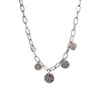 Collar acero plateado de 40cm. graduable a 46cm. con cadena eslabones de 1cm., de la que cuelgan cinco chapitas martilladas de diferentes tamaños.