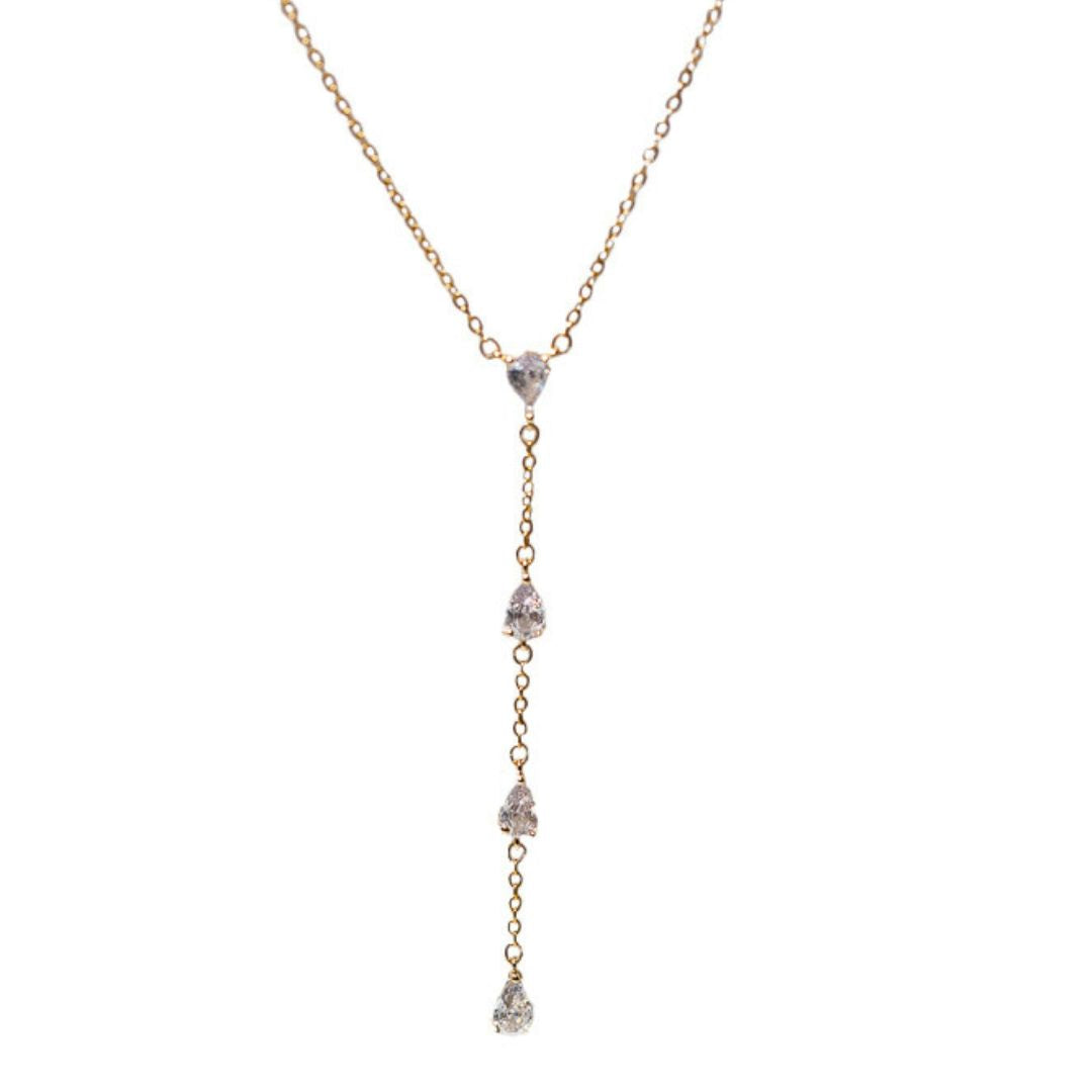 Collar acero dorado de 41cm. graduable a 46cm. Collar cadena fina de la que cuelgan cuatro cristalitos triangulares con un largo total de 6,5cm. provocando que la joya brille con sus destellos.