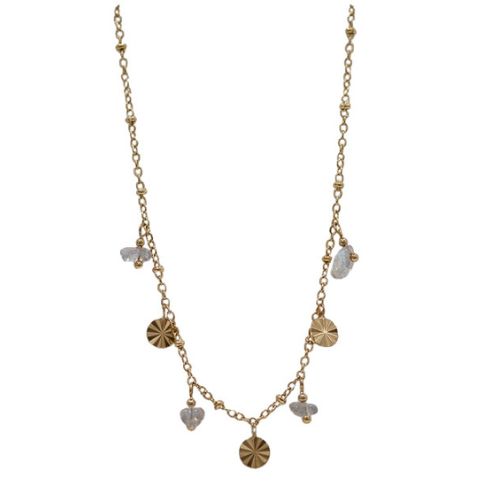 Collar acero dorado de 37cm. graduable a 43cm., con cadena de bolitas de la que cuelgan tres chapitas rayadas alternadas con cuatro minerales transparentes.