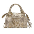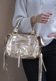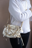 Bolso de piel dorado. Medidas exterior: 17cm. x 24cm. x10cm. Tiene doble asa de mano, más correa ajustable para poder cruzarlo. Cierre con cremallera y dos bolsillos internos más uno externo.