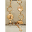 Cinturón tipo cadena elaborado en metal dorado brillante. Su diseño se compone de una cadenas más chapas martilladas alternadas con aros lisos. El largo total es de 100cm. con cierre mosquetón que se ajusta a la medida que necesites.
