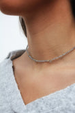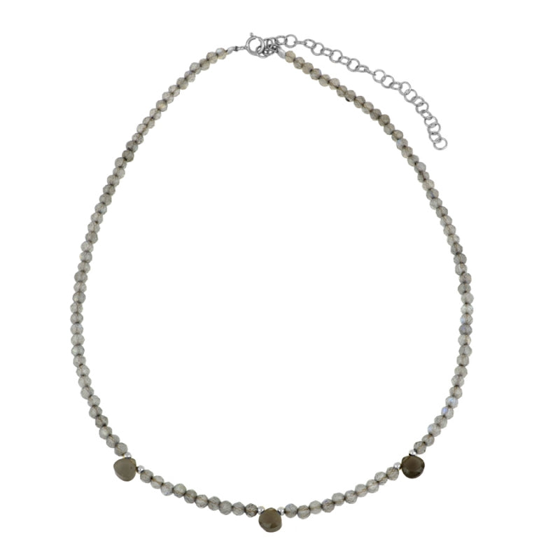 Gargantilla de 35cms. graduable hasta 42cms. envuelta con labradoritas, más tres de mayor tamaño colgando en forma de gota. Disponible en Plata de Ley 925 y en Baño de Oro 18kts.