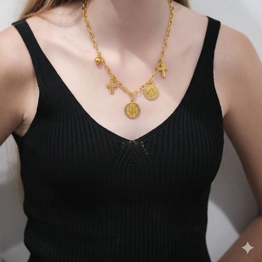 Collar acero dorado de 40cm. graduable a 45cm. y ajustable a cualquier eslabón del collar. Su diseño está compuesto por una cadena de eslabones amplios, de la que cuelgan cinco charms: cruces texturizadas, medallas y una pequeña esfera.