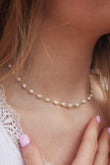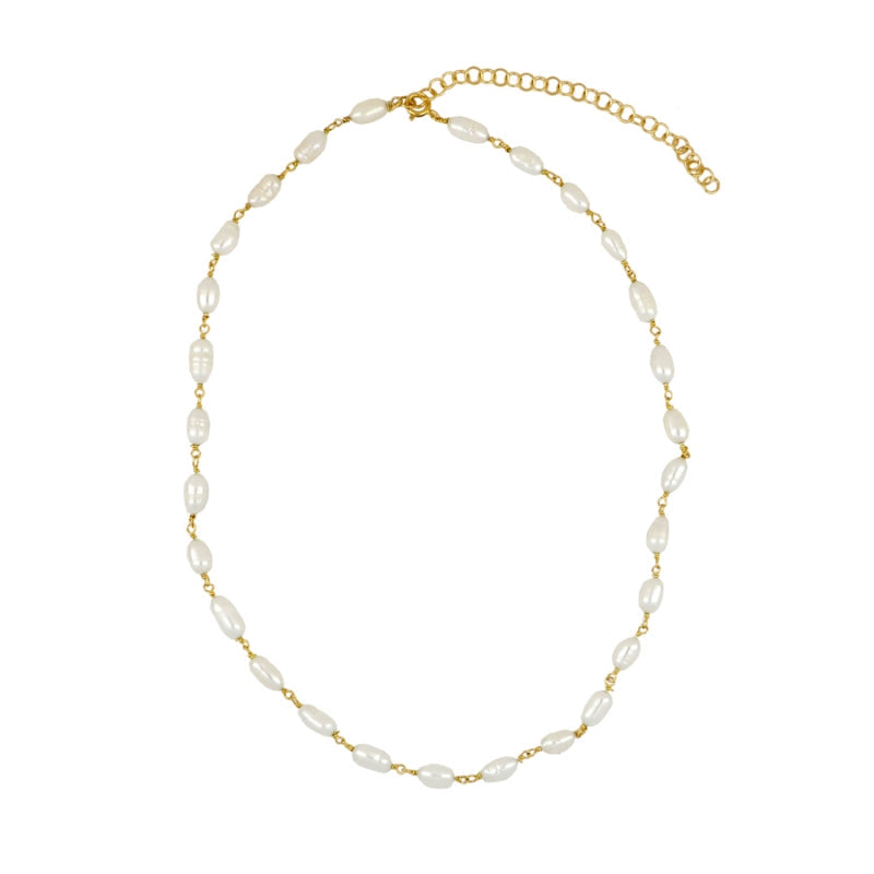 Gargantilla de 35cms. graduable hasta 43cms. Diseño de cadena con perla en forma de arroz intercalada cada 5mm.Disponible en Plata de Ley 925 y en Baño de Oro 18kts.