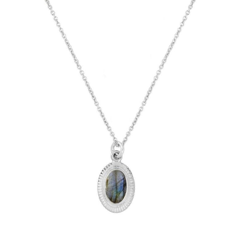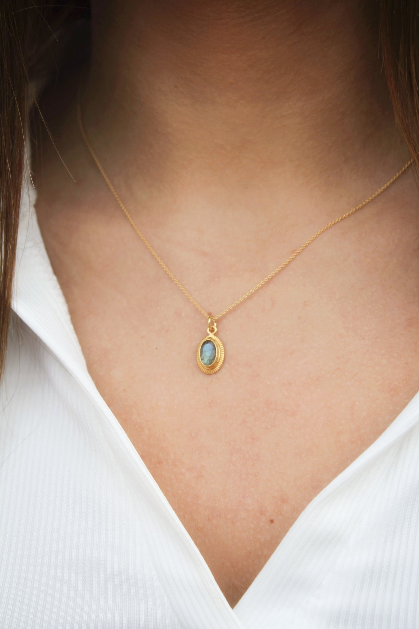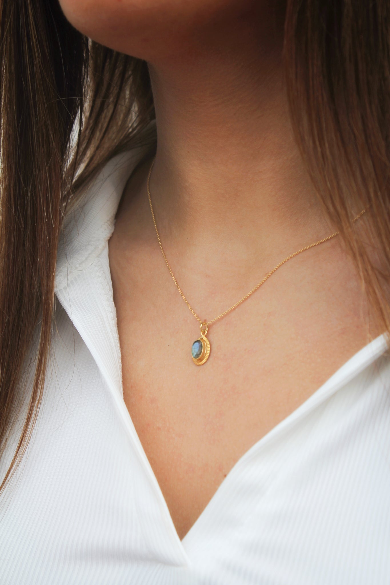Gargantilla de 38cms. graduable hasta 43cms. Cadena con charm de 12mm.x8mm. sosteniendo una labradorita. Disponible en Plata de Ley 925 y en Baño de Oro 18kts.