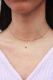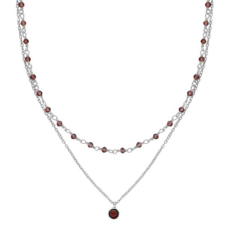 Gargantilla de 38cms. graduable hasta 43cms. Cadena doble con un rosario de pequeños granates de Mozambique cada 10mm. y una segunda cadena con un granate colgando de 4mm.Disponible en Plata de Ley 925 y en Baño de Oro 18kts.