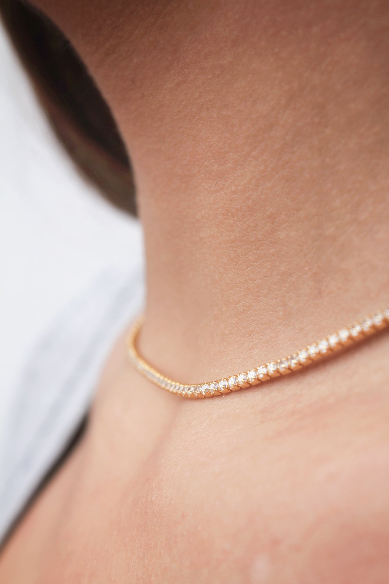 Chocker de 33cms. graduable hasta 40cms. y rodeado de circonitas blancas de 1,75mm. cada una. Disponible en Plata de Ley 925 y en Baño de Oro 18kts.