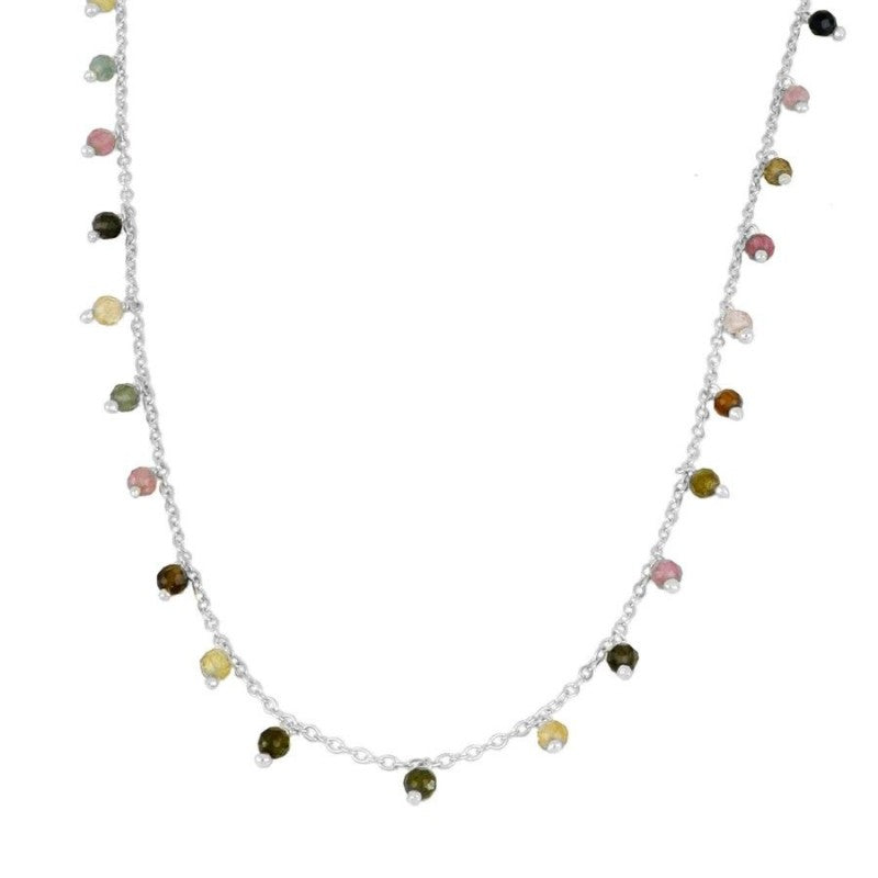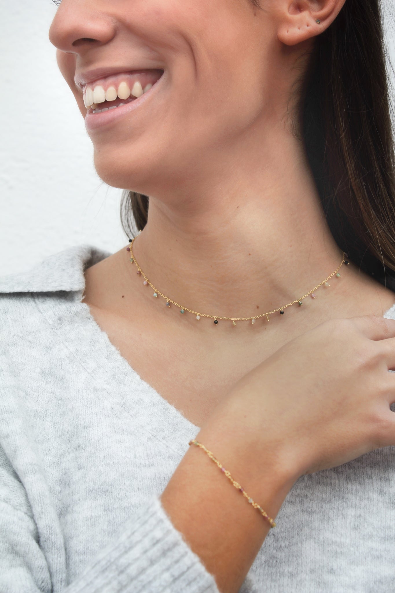 Gargantilla de 35cms. graduable hasta 42cms. Diseño de cadena con pequeñas turmalinas colgando. Disponible en Plata de Ley 925 y en Baño de Oro 18kts.