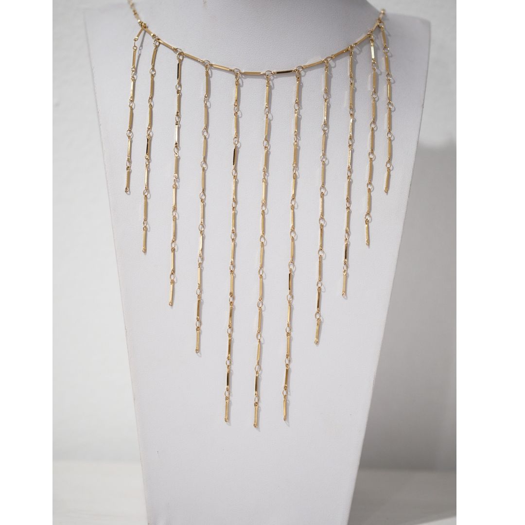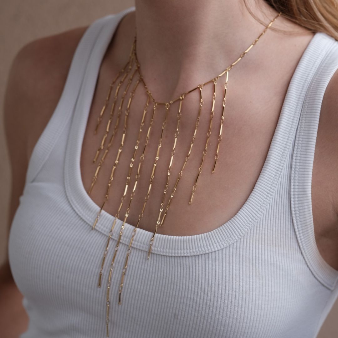 Collar acero dorado de 40cm graduable a 45cm. Sus once cadenas doradas descienden en hilos finísimos, creando una caída viva que juega con cada gesto. La estructura, enmarca el escote con un ritmo propio, delicado pero seguro, simple pero magnético. Una pieza que no solo adorna, trae presencia. Un collar que dibuja Luz.