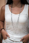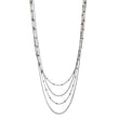 Collar acero plateado largo formado por cuatro cadenas de cola ratón, de las que dos tienen bolitas intercaladas. Las cadenas caen a diferentes alturas.