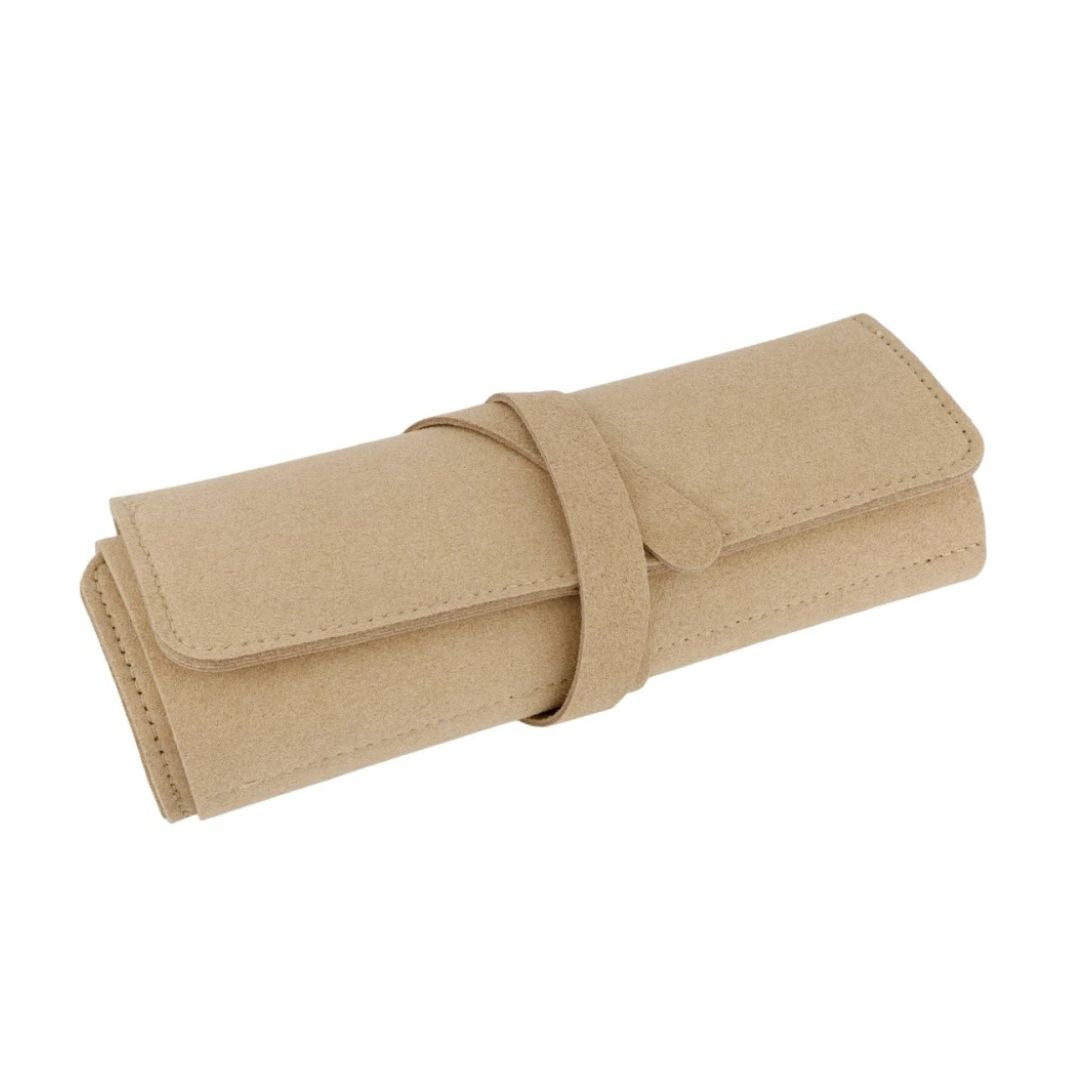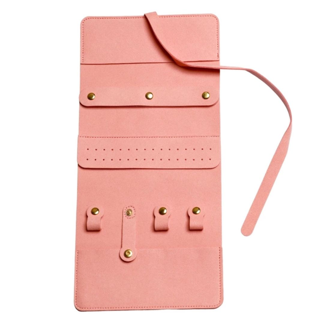 Joyero de cuero sintético, suave al tacto. Resistente para acompañarte en cada aventura. Su diseño compacto de 17,5 × 36 cm. abierto, cabe perfectamente en tu bolso o maleta, mientras su interior organizado mantiene anillos, collares, pulseras y pendientes en orden. Disponible en rosa y tostado.