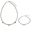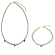 Merengue es un pack de labradoritas que debido a su tonalidad grisácea combinan muy bien con colores neutros como blanco, negro, gris y azul marino. Está formado por nuestro collar Clue y la pulsera Amy. Disponible en Baño de Oro y Plata.