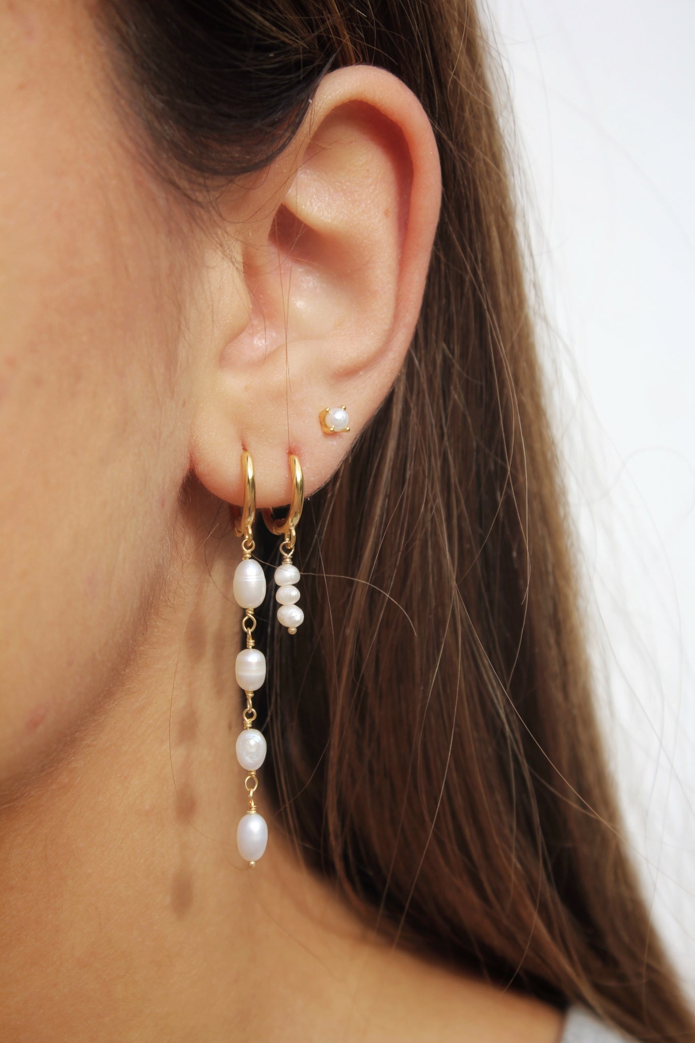 Pendiente aro click de 11mm. con tres perlas naturales en cascada. Pendiente para uso combinable a primer agujero o piercing. Se puede adquirir por unidad o par. Disponible en Plata de Ley 925 y en Baño de Oro 18kts.
