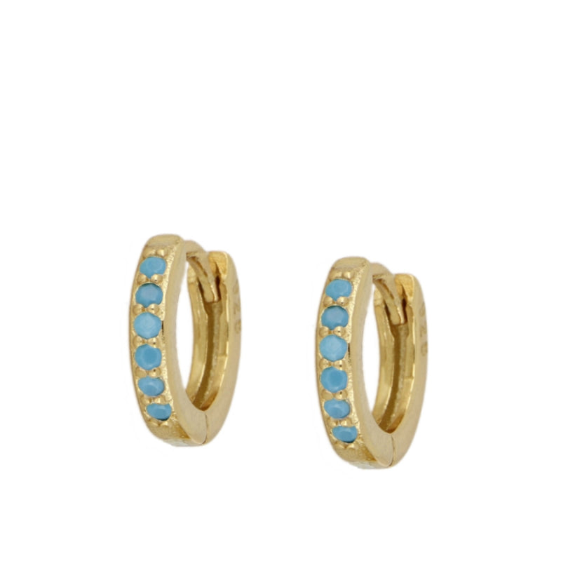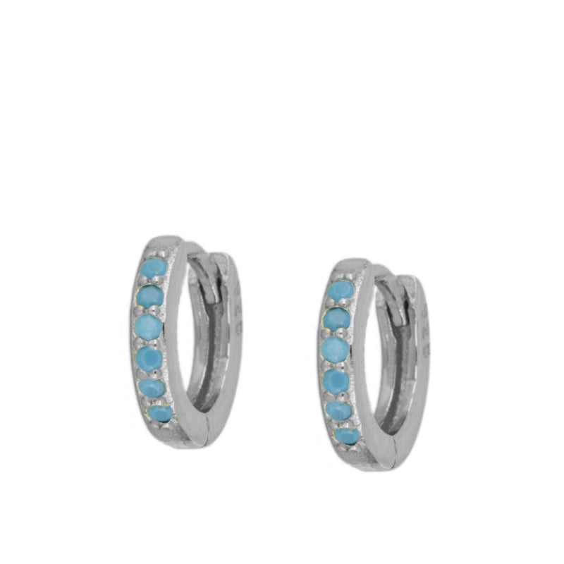 Pendiente aro de 10mm. exterior. La mitad del aro está cubierto por seis circonitas turquesas. Se pueden adquirir por unidad o par. Disponible en Plata de Ley 925 y en Baño de Oro 18kts.