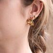 Pendientes de acero dorado, con doble forma semiovalada y superficie en relieve con líneas geométricas. Su acabado pulido refleja la luz con un brillo sutil. Miden 1,6cm. de ancho y cuentan con cierre a presión, ofreciendo un equilibrio entre firmeza y ligereza. Una pieza que destaca por su diseño estructurado y su carácter atemporal, ideal para el día a día.