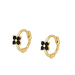 Pendiente aro de 10,5mm. exterior y 1,20mm. de ancho. En el frontal del pendiente dibuja una flor de cuatro pétalos de circonitas negras. Se puede adquirir por unidad o par. Disponible en Plata de Ley 925 y en Baño de Oro 18kts.