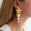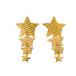 Pendientes de acero dorado con cierre a presión y 8cm. de largo. Cuatro estrellas ralladas descienden en tamaño creando una caída ligera y llena de movimiento. Una pieza luminosa que combina fuerza y delicadeza.