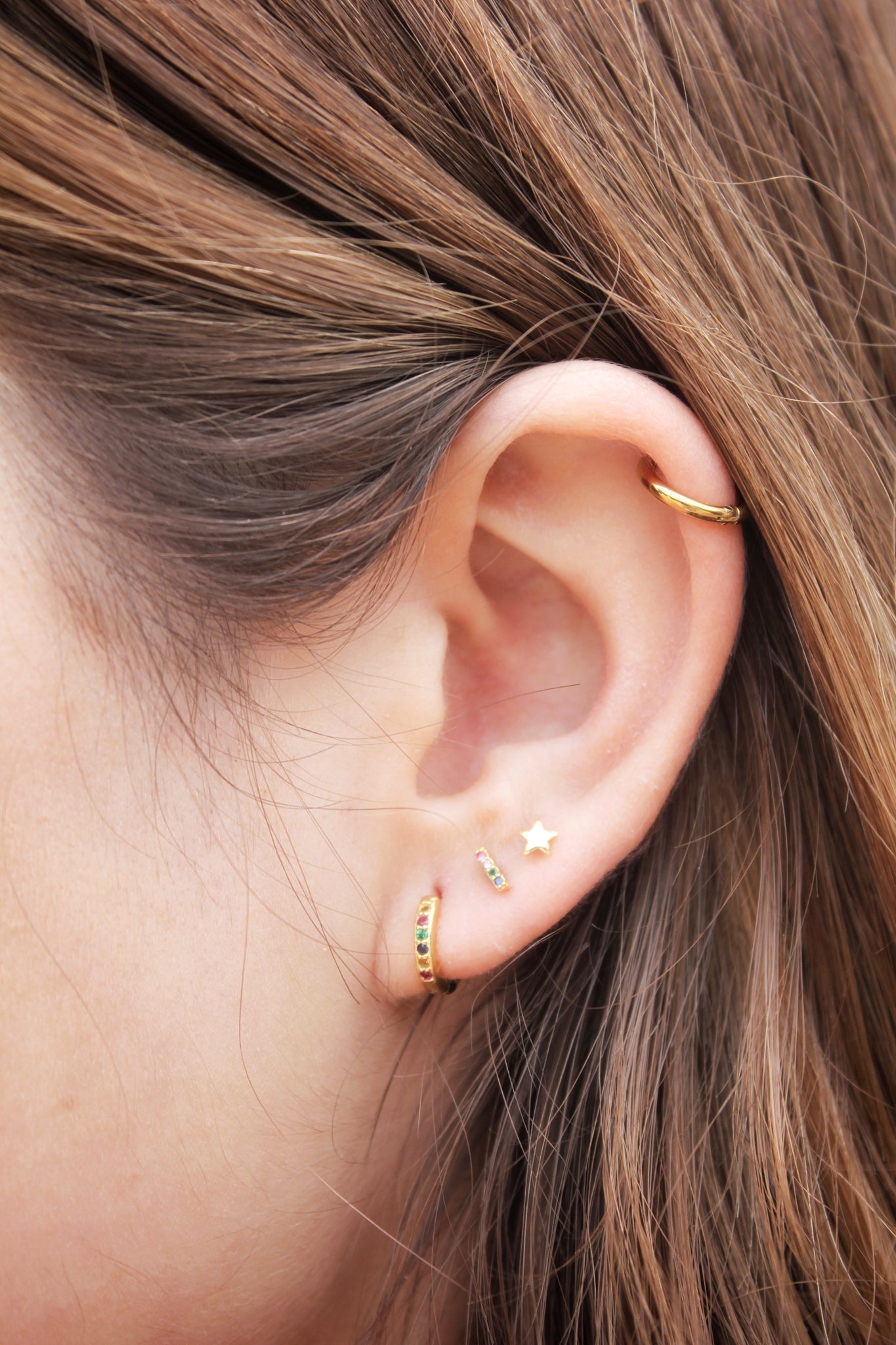 Pendiente mini en forma estrella de 3,5mm. Ideal para usar en cualquier agujero del lóbulo. Se puede adquirir por unidad o par. Disponible en Plata de Ley 925 y en Baño de Oro 18kts.
