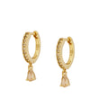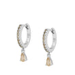 Pendiente aro de 13,5mm. externo y 2mm. de grosor , en el que medio aro tiene insertadas nueve pequeñas circonitas. El diseño lo completa una gota suspendida con circonita champagne, tamaño 5x3mm. El color champagne da una gran posibiidad de combinación. Se pueden adquirir por unidad o par. Disponible en Plata de Ley 925 y en Baño de Oro 18kts.