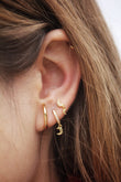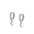 Pendiente aro de 10mm. externo, envuelto en su mitad por seis circonitas blancas, con luna suspendida de 4x4,8mm. Se pueden adquirir por unidad o par. Disponible en Plata de Ley 925 y en Baño de Oro 18kts.