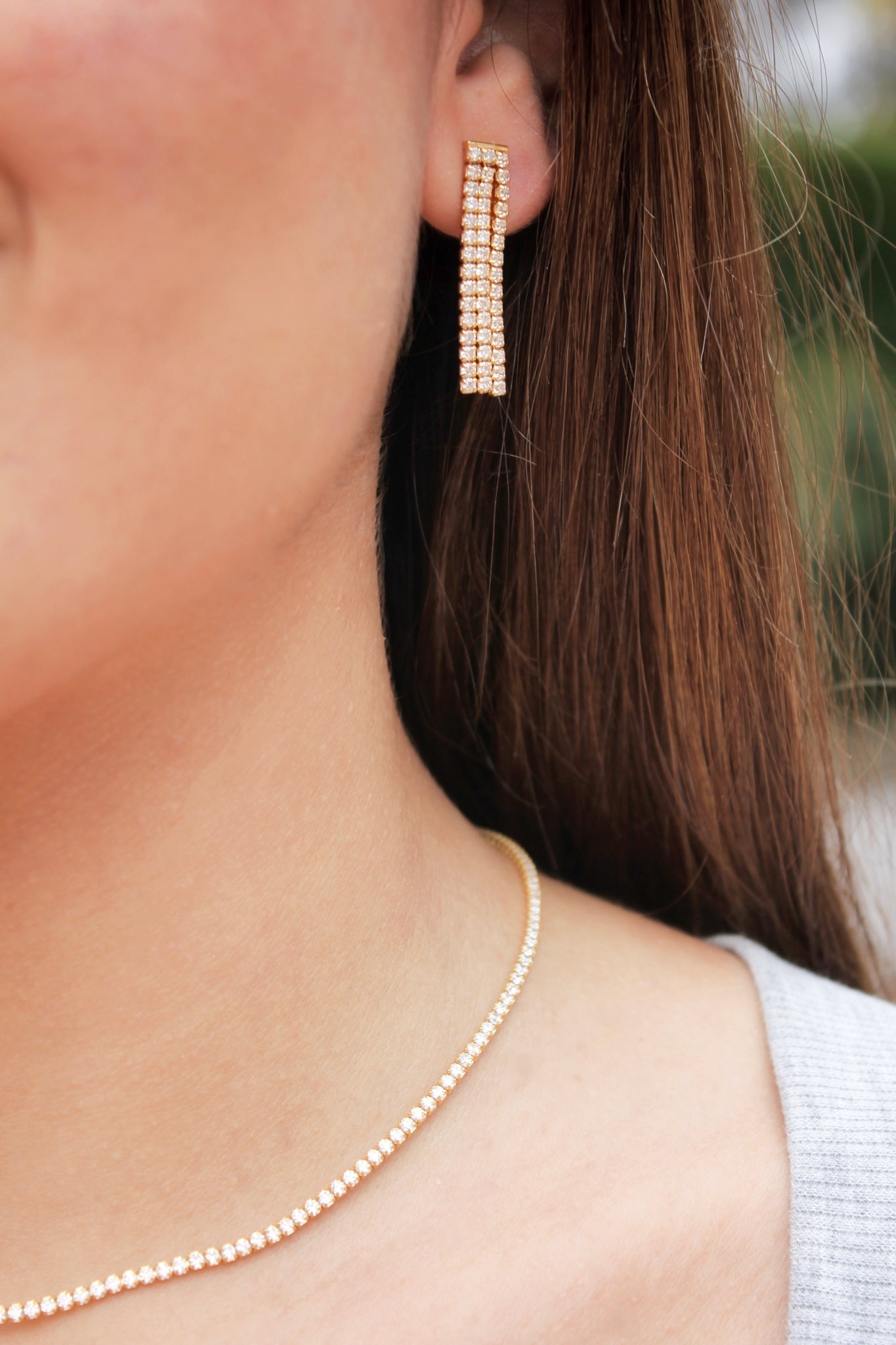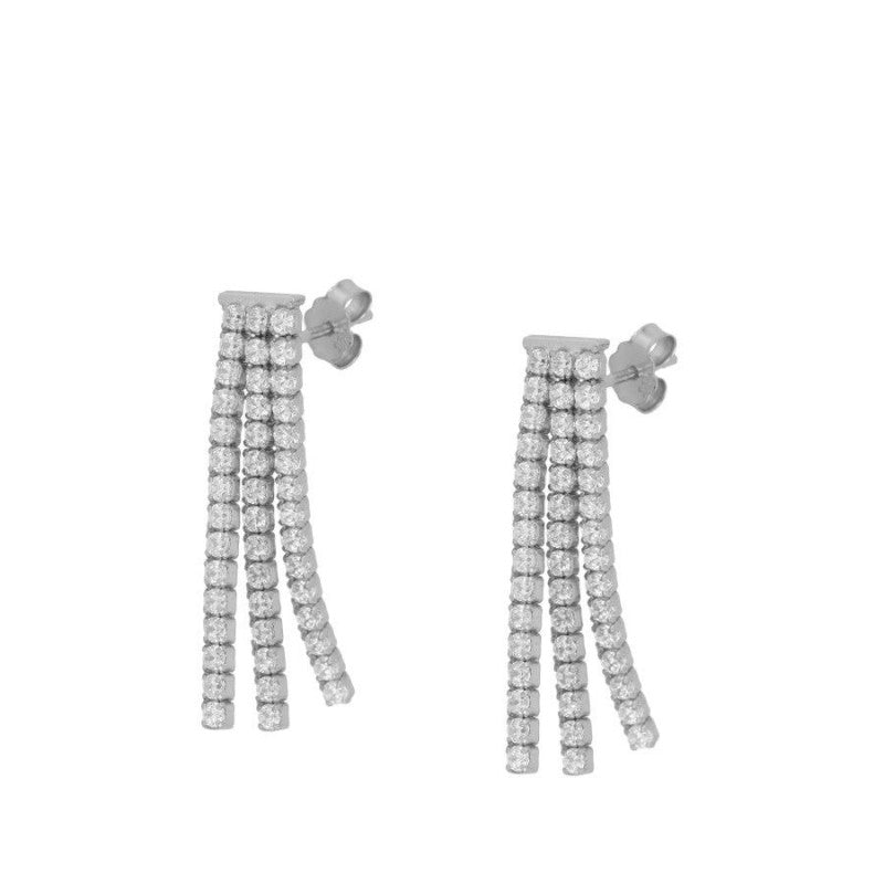 Pendiente de tres elegantes cascadas de quince circonitas blancas cada una y con un largo de 3cm. Disponible en Plata de Ley 925 y en Baño de Oro 18kts.