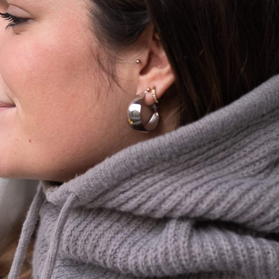 Pendiente aro de acero con cierre omega de 2,5cm. diámetro y con un ancho de 1,2cm. Esta joya destaca por su ligereza y comodidad. Una pieza que querrás que te acompañe en tu día.
