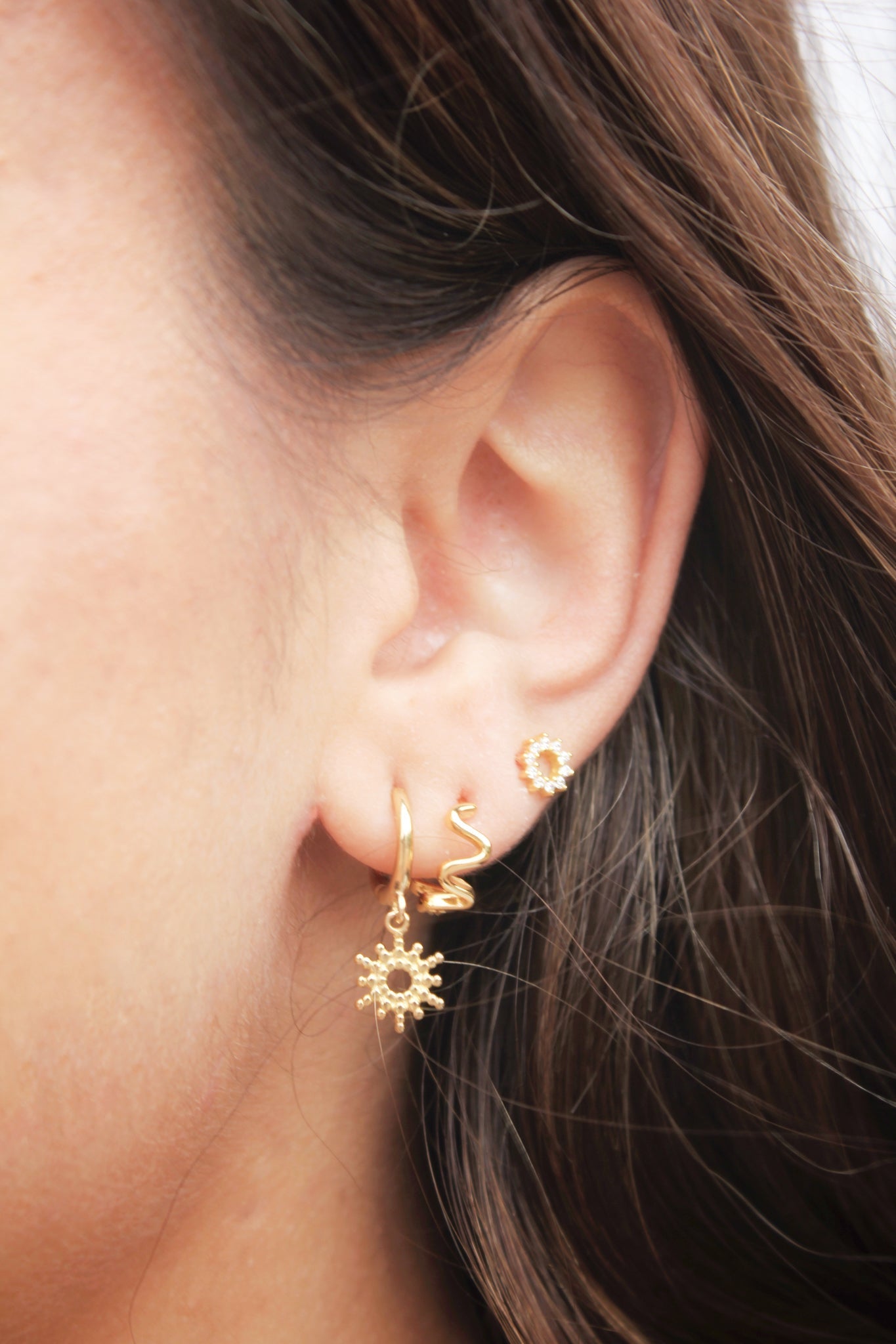 Pendiente mini en forma de sol de 6mm. con aro hueco y rodeado por diez pequeñas circonitas. Ideal para usar en cualquier agujero del lóbulo. Se puede adquirir por unidad o par. Disponible en Plata de Ley 925 y en Baño de Oro 18kts.