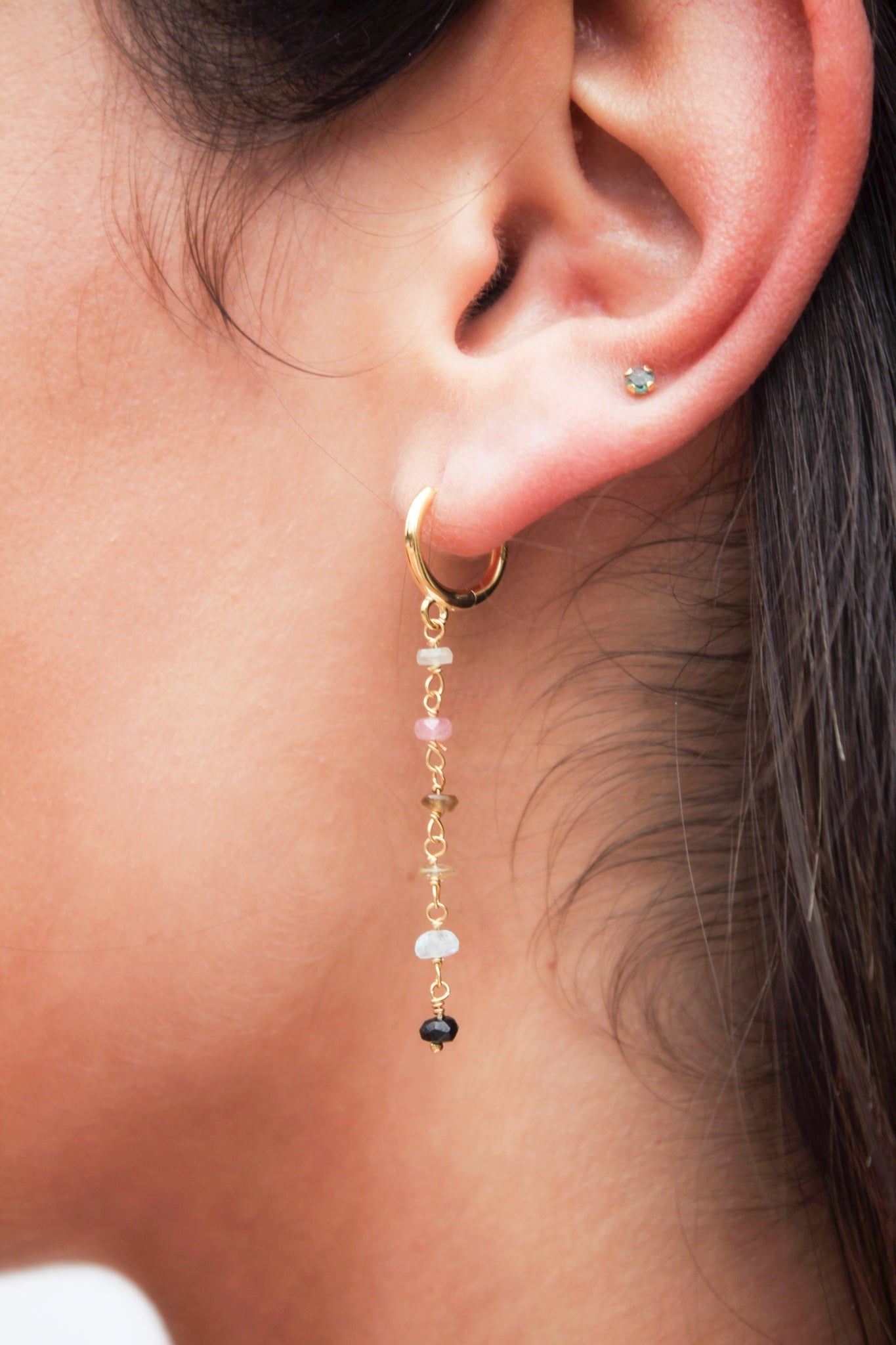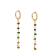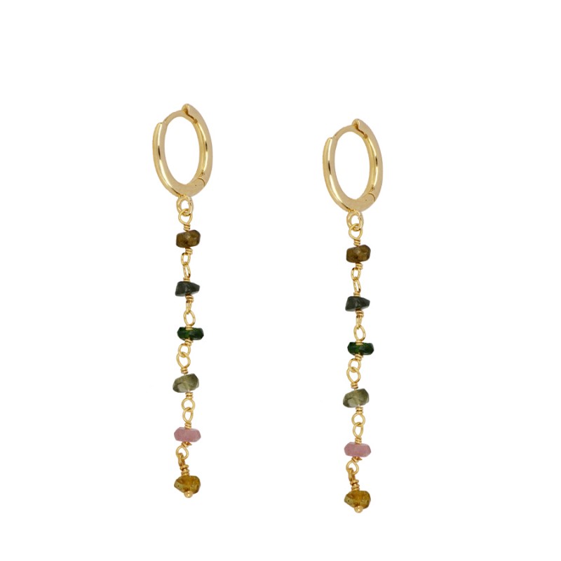 Pendiente aro de 11mm. con 4,5cm. de cascada de turmalina. La turmalina es el cuarzo de protección por excelencia, pudiendo presentar una gran variedad de colores y tonalidades. Disponible en Plata de Ley 925 y en Baño de Oro 18kts.