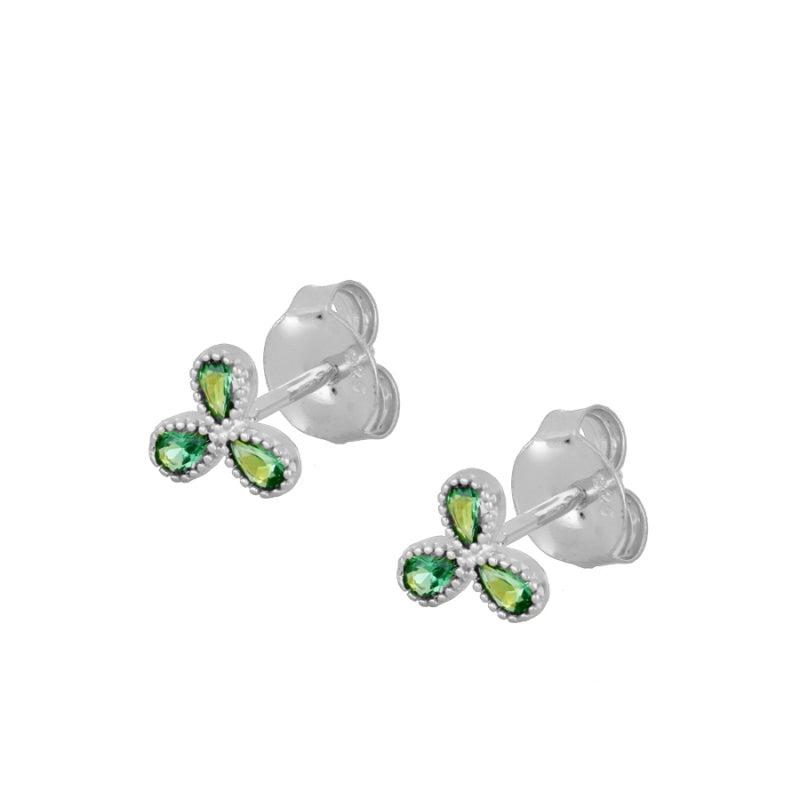 Pendiente de 6mm. con tres pétalos de circonitas verde. Para uso combinable a primer agujero o piercing. Se puede adquirir por unidad o par. Disponible en Plata de Ley 925 y en Baño de Oro 18kts.