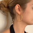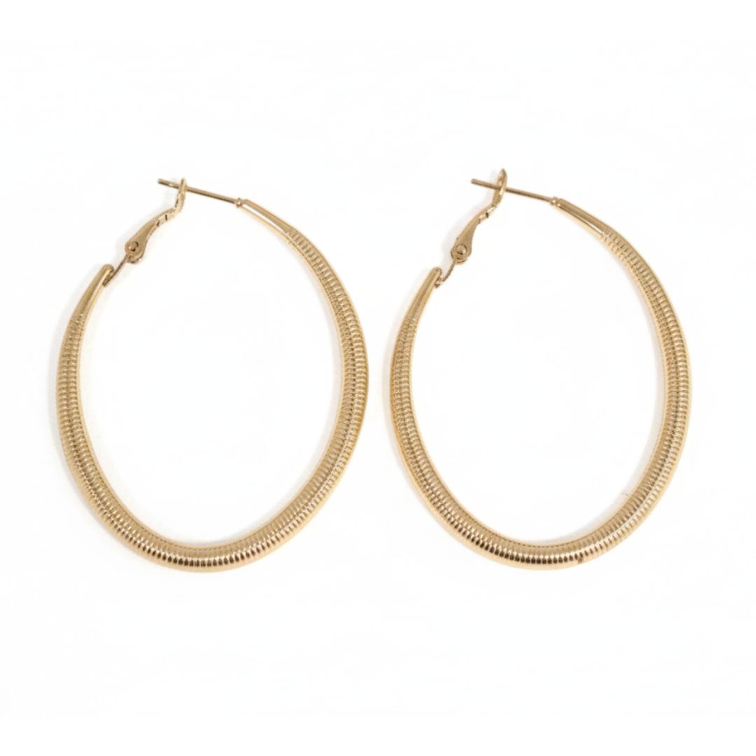 Pendiente acero dorado con cierre ballestina de 5cm. de largo. Los aros Riff no son un aro estándar, su silueta ovalada alarga la línea del cuello, ofreciendo una elegancia más depurada. El verdadero distintivo está en su textura acanalada, que atrapa la luz de forma dinámica. Cómodos y ligeros para tu día a día.