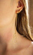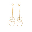 Pendiente acero dorado de cierre click con un largo de 9,5cm. Cuelgan dos cadenas de 7cm. y 6cm. con un aro martelado cada una de 2,2cm. y 1,8cm.