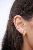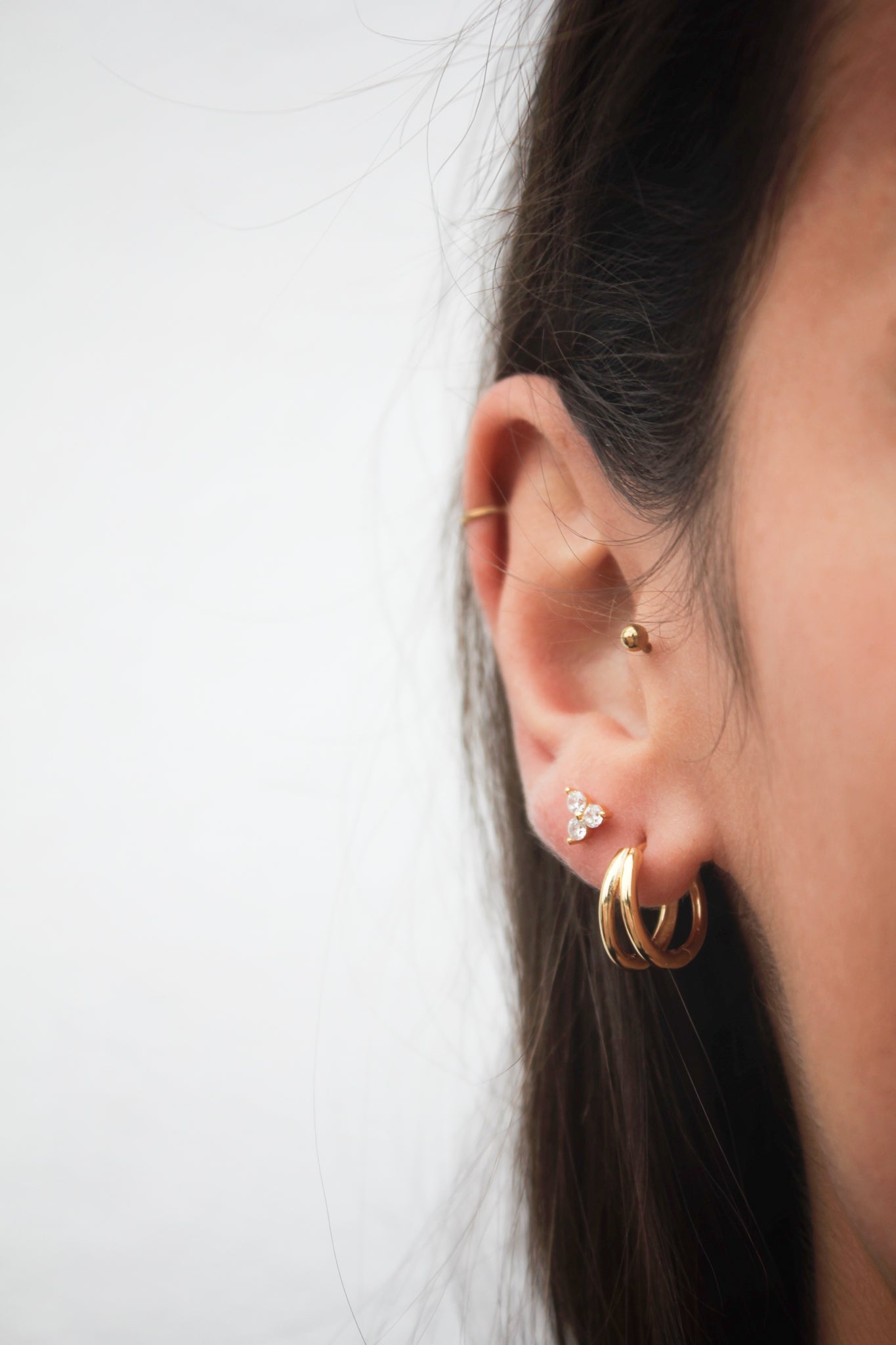 Pendiente piercing de 6mm. con tres circonitas blancas en triángulo. Se puede adquirir por unidad o par. Disponible en Plata de Ley 925 y en Baño de Oro 18kts.