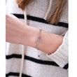 Pulsera de acero plateado, con una longitud inicial de 16,5 cm. extensible hasta 21 cm. Su diseño cuenta con una delicada doble cadena tipo ratón uniéndose en el centro con un encantador símbolo de infinito.