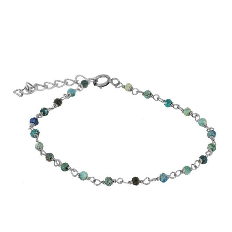 Pulsera de 15cms. graduable hasta 18cms., con cadena rosario de crisocola intercaladas. Disponible en Plata de Ley 925 y en Baño de Oro 18kts.