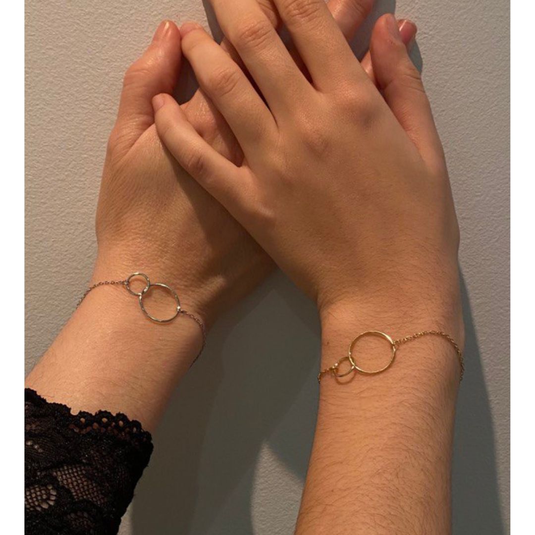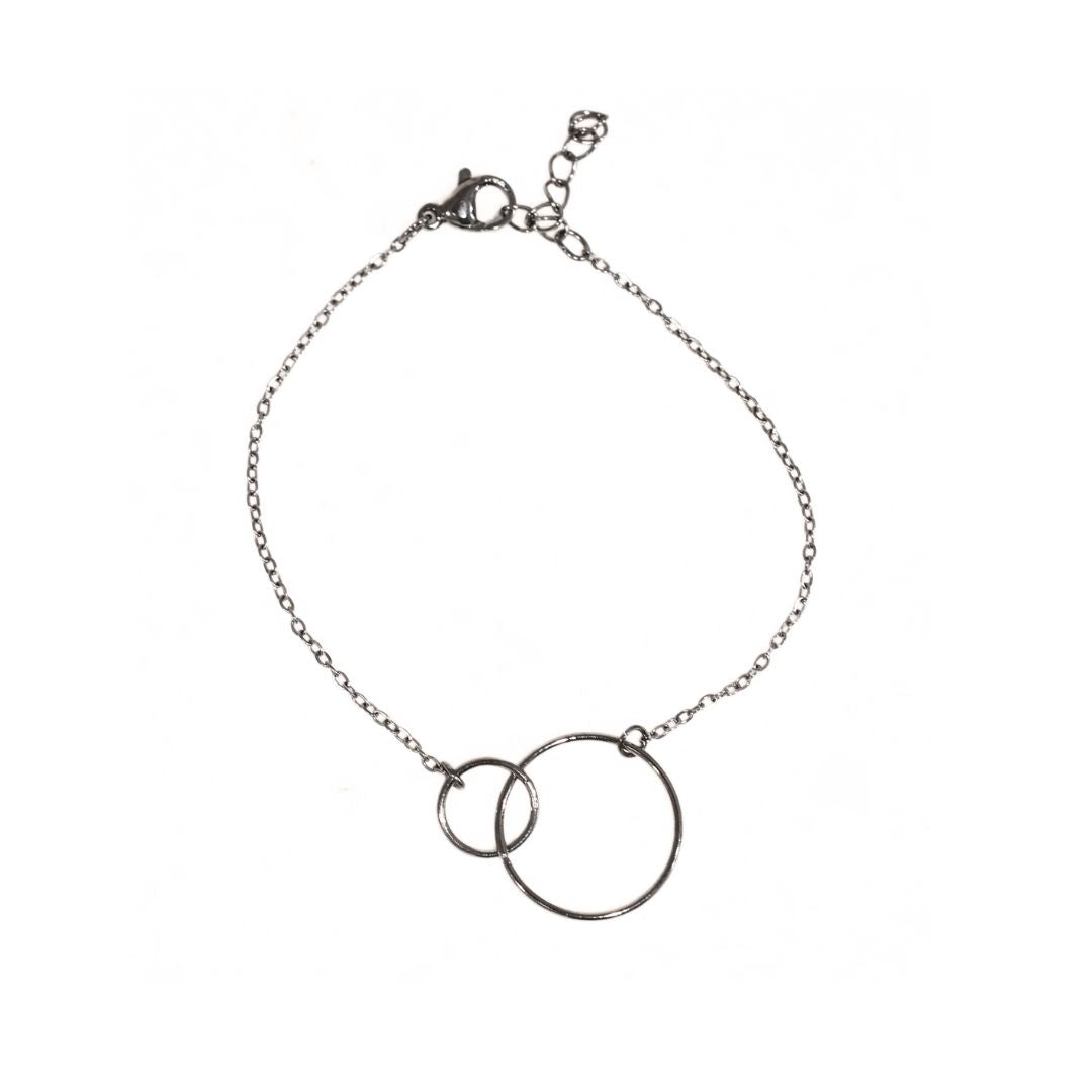 En el centro incorpora dos aros enlazados, símbolo de conexión, armonía y equilibrio. Su cadena fina aporta un toque delicado, mientras que el cierre ajustable permite adaptarla cómodamente a distintas medidas de muñeca desde 17cm. un 19,5cm.
